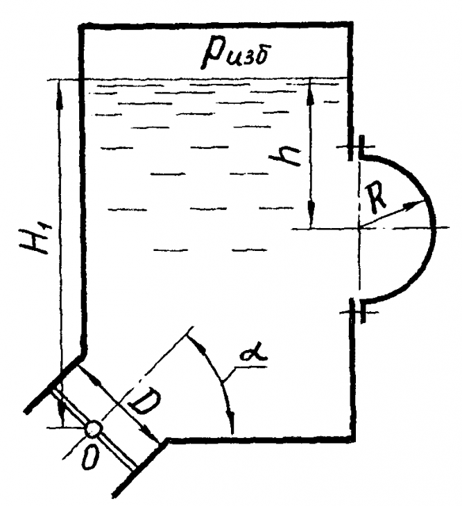 Задача 2-7 Дано: h=0,6 м; D=0,32 м; H1=1 м; α=40º, R=0,2 м, pизб(pм)=0,025 МПа.