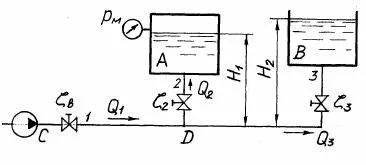 Насос подает жидкость Ж при температуре Т в два резервуара. Возвышение уровня жидкости над осью насоса в первом резервуаре равно H1, манометр показывает давление рм. Возвышение уровня жидкости во втором открытом резервуаре равно H2 =14,5 м. Параметры отрезков трубопровода: Li Δ, di. Для каждого отрезка из местных сопротивлений учитывать только сопротивление вентиля с коэффициентом ξв, ξ2, ξ2=2∙ξ2 соответственно. Давление на выходе из насоса равно pС. Определить подачу жидкости в каждый резервуар.