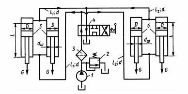 Автомобиль повышенной проходимости имеет четыре дополнительных ведущих колеса (катка), которые могут опускаться на грунт или подниматься с помощью гидросистемьг, показанной схематически на рисунке. Система состоит из насоса 1, предохранительного клапана 2, фильтра 3, трехпозиционного распределителя 4 и четьгрех гидроцилиндров: двух передних 5 и двух задних 6. Определить время подъема передних и задних колес, если сила веса на каждое колесо G = 2 кН; рабочий объем насоса V = 0,012 л; частота вращения n = 1250 об/мин; объемный к.п.д. при давлении Рн =10 МПа, ?0= 0,85; размерьг. D = 40 мм; dш = 25 мм; l = 500 мм; l1=2 м; l2=5 м; d = 6 мм; свойства жидкости: р = 900 кг/м3; v = 0,4 Ст. Местные сопротивления заменить эквивалентньши длинами труб: фильтр - lф = 250d; распределитель (каждый канал) lр=100d. Потери давления на трение по длине учесть лишь на участках, длины которых даны (l1 и l2).