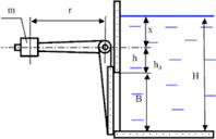 1. Найти минимальную массу груза m, достаточную для удержания воды в резервуаре на уровне H = 2 м, если расстояние от верхней кромки отверстия до оси вращения h = 0,3 м. Определить при этом реакции R цапф A щита.