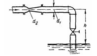 По трубопроводу диаметром d1 = 50 мм, в котором установлена труба Вентури с горловиной d2 = 25 мм, вода сливается под постоянный уровень, расположенный ниже оси расходомера на h = 2 м. Коэффициент потерь в диффузоре расходомера φД = 0,25 и коэффициент сопротивления угольника ξ = 1.