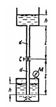 Вода подается в открытый верхний бак по вертикальной трубе (d = 25мм; l = 3 м; h = 0,5м) за счет избыточного давления М в нижнем замкнутом баке. Определить давление М, при котором расход будет равен Q= 1,5 л/сек. Коэффициент сопротивления полностью открытого вентиля ξ = 9,3. Коэффициент сопротивления трения определить по заданной шероховатости трубы 0,2 мм, предполагая наличие квадратичного режима. Построить график напоров по высоте трубы.
