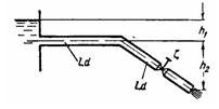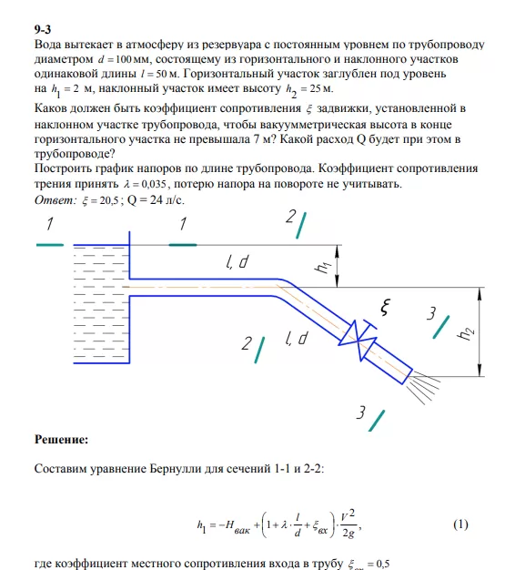 Задача (Куколевский И.И.) 9-3. Вода вытекает в атмосферу из резервуара с постоянным уровнем по трубопроводу диаметром d=100 мм, состоящему из горизонтального и наклонного участков одинаковой длины l = 50 м. Горизонтальный участок заглублен под уровень на h1 = 2м, наклонный участок имеет высоту h2 = 25 м.