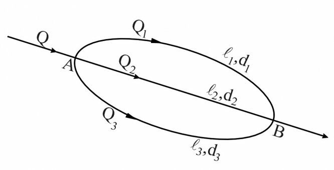 Главная » Учебные материалы » Механика жидкости и газа (МЖГ или Гидравлика) » Решения задач » Определить потери напора на участке АВ и расход в трёх параллельных ветвях водопроводной сети. L1 = 1000 м, L2 = 600 м, L3 = 1500 м. Диаметры d1 = 300 мм, d2 = 250 мм, d3 = 150 мм, Расход Q = 100 л/сек.
