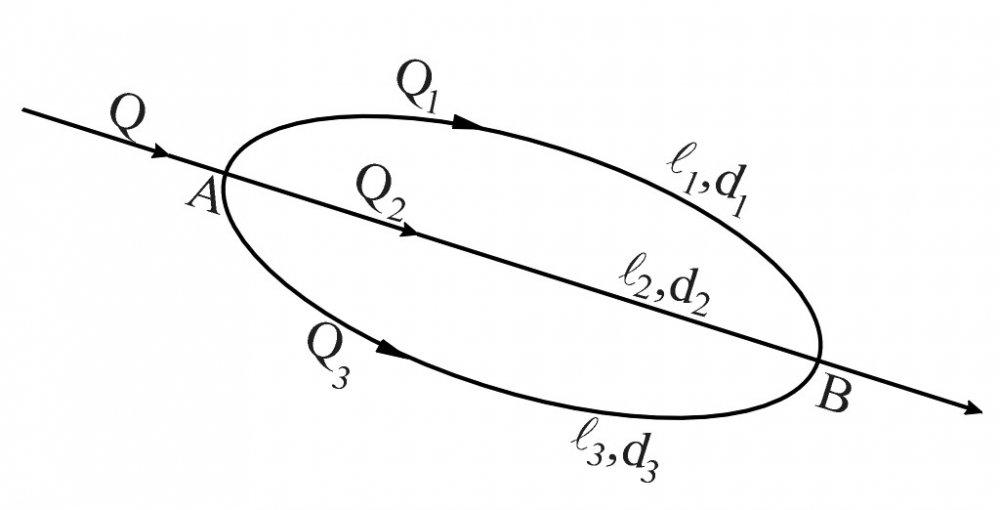 Определить потери напора на участке АВ и расход в трёх параллельных ветвях водопроводной сети. L1 = 1000 м, L2 = 600 м, L3 = 1500 м. Диаметры d1 = 300 мм, d2 = 250 мм, d3 = 150 мм, Расход Q = 100 л/сек.