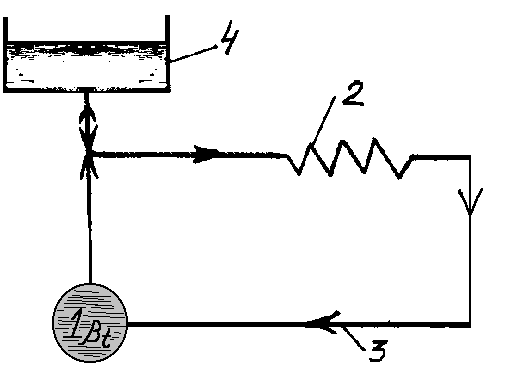 Система водяного отопления с естественной циркуляцией состоит из котла 1, нагревательного прибора 2, труб 3 и расширительного сосуда 4, сообщающегося с атмосферой. Внутренний объем системы отопления W, объем расширительного сосуда ∆W. Во время