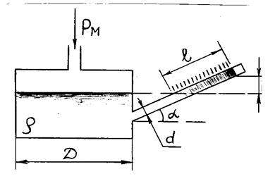 Для измерения малых давлений рм в газах применяются чашечные микроманометры, заполненные жидкостью плотностью ρ, с наклонной на угол α стеклянной трубкой и шкалой.
