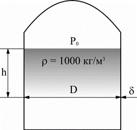 Известно, что D=3 м, d=10 мм, h=2,5 м. Определить напряжение s в стенках резервуара при давлении воздуха р0=0,2МПа.