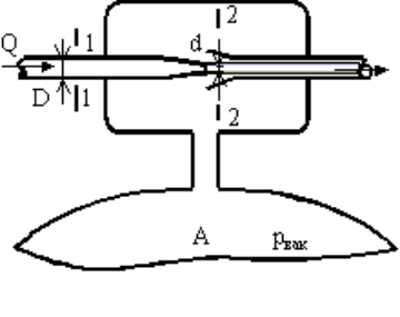 Для создания разряжения воздуха рвак в сосуде А используется водоструйный насос, к которому вода (r = 1000 кг/м3) в количестве Q подается по трубе внутренним диаметром D, которая сужается в насосе до диаметра d. Манометриче-ское давление перед насосом р1. Потерями напора пренебречь.