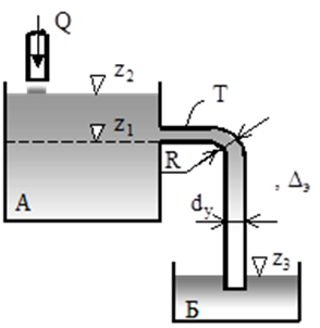 В резервуар А поступает вода ( n = 0,01 Ст ), расход которой изменяется от 0 до Q. Уровень воды в резервуаре не должен быть ниже отметки z1 и выше отметки z2. Для выполнения этих условий резервуар А оборудован стальной электросварной умеренно корродированной переливной трубой Т диаметром dу, длиной l, имеющей один поворот на 90° радиусом R. Переливная труба перепускает излишки воды в резервуар Б, уровень в котором находится на отметке z3.
