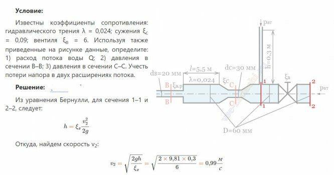 Главная » Учебные материалы » Механика жидкости и газа (МЖГ или Гидравлика) » Решения задач » Несколько классов/семестров » Известны коэффициенты сопротивления: гидравлического трения λ = 0,024; сужения ξс = 0,09; вентиля ξв = 6. Используя также приведенные на рисунке данные, определите: 1) расход потока воды Q; 2) давления в сечении В–В; 3) давления в сечении С–С. Учесть