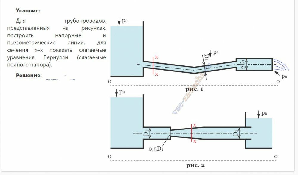 Для студентов по предмету Механика жидкости и газа (МЖГ или Гидравлика)Для трубопроводов, представленных на рисунках, построить напорные и пьезометрические линии, для сечения х–х показать слагаемые уравнения Бернулли (слаДля трубопроводов, представленных на рисунках, построить напорные и пьезометрические линии, для сечения х–х показать слагаемые уравнения Бернулли (сла