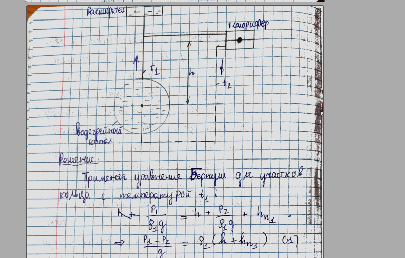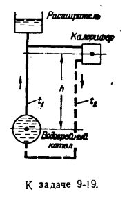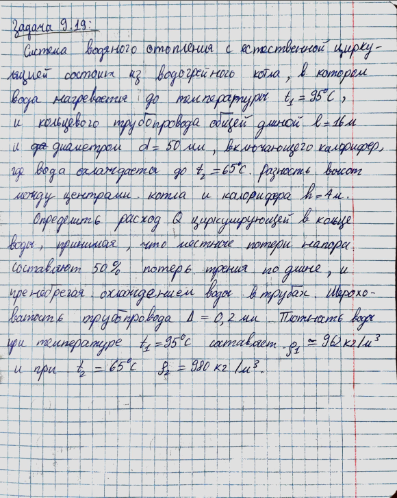 Система водяного отопления с естественной циркуляцией состоит из водогрейного котла, в котором вода нагревается до температуры t1 = 95 ℃, и кольцевого трубопровода общей длиной l = 16 м и диаметром d = 50 мм, включающего калорифер, где вода охлаждается до t2 = 65 ℃. Разность высот между центрами котла и калорифера h = 4 м.Определить расход Q циркулирующей в кольце воды, принимая, что местные потери напора составляют 50% потерь трения по длине, и пренебрегая охлаждением воды в трубах. Шероховатость трубопровода Δ = 0,2 мм. Плотность воды при температуре t1 = 95 ℃ составляет ρ1 = 962 кг/м3 и при t2 = 65 ℃ ρ2 = 980 кг/м3.