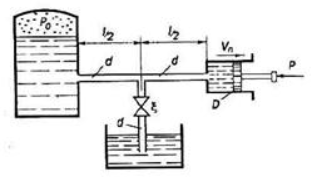 Задача (Куколевский И.И.) 10.37. Поршень гидравлического цилиндра, имеющий диаметр D = 60 мм и нагруженный внешней силой Р = 2250 Н, перемещается под давлением масла (б = 0,815, V = 0,5 Ст), поступающего в цилиндр из пневмогидравлического аккумулятора по магистральной трубе (l = 20 м, d = 15 мм). 1) Определить, при каком коэффициенте сопротивления С дросселя на сливной трубе (диаметром с1 = 15 мм), присоединенной к магистрали в середине ее длины, скорость поршня будет vn= 0,2м/с, если избыточное давление в аккумуляторе P0 = 1,35 МПа. Разностью высот расположения агрегатов системы и местными потерями напора в магистральной трубе пренебречь. В сливной трубе учитывать только сопротивление дросселя. 2) Какова будет скорость поршня, если полностью закрыть дроссель на сливной трубе? 3) При каком минимальном значении ^ дросселя поршень остановится?