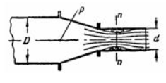 Задача (Куколевский И.И.) 7-9. Трубопровод диаметром D = 160 мм оканчивается насадком, который состоит из конуса и короткого цилиндрического участка диаметром d = 80 мм. Коэффициент сопротивления конуса, отнесенный к скорости в сжатом сечении n-n, равен ? = 0,1; коэффициент сжатия струи в этом сечении ? = 0,8. Пренебрегая упругостью паров воды, найти предельное давление р перед насадком, при котором он перестанет работать сплошным выходным сечением, т. е. при котором вакуум в сечении n-n насадка достигнет 10 м. При этом давлении найти расход через насадок и построить график напоров по его длине.