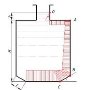 Емкость высотой Н=9,0 м заполнена нефтью на уровень, как показано на рисунке. Определить давление жидкости в точках А, В и С и построить эпюры гидростатического давления на боковые стенки и дно емкости, если h=1,5 м, l=2,0 м, α=45°.