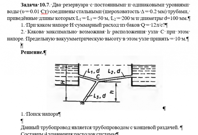 Задача 10.7. Два резервуара с постоянными и одинаковыми уровнями воды (υ = 0.01 Ст) соединены стальными (шероховатость Δ = 0.2 мм) трубами, приведённые длины которых L1 = L3 = 50 м, L2 = 200 м и диаметры d=100 мм.