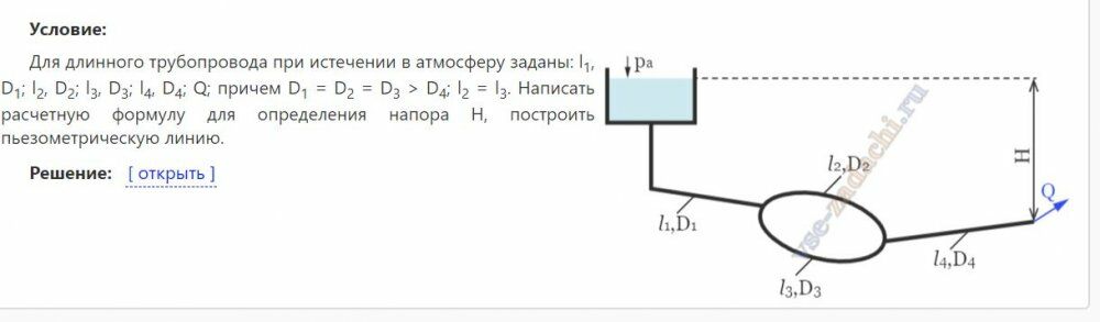 Для студентов по предмету Механика жидкости и газа (МЖГ или Гидравлика)Для длинного трубопровода при истечении в атмосферу заданы: l1, D1; l2, D2; l3, D3; l4, D4; Q; причем D1 = D2 = D3 > D4; l2 = l3. Написать расчетную фДля длинного трубопровода при истечении в атмосферу заданы: l1, D1; l2, D2; l3, D3; l4, D4; Q; причем D1 = D2 = D3 > D4; l2 = l3. Написать расчетную ф