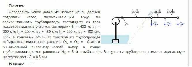 Определить, какое давление нагнетания pн должен создавать насос, перекачивающий воду по горизонтальному трубопроводу, состоящему из трех последовательных участков размерами l1 = 400 м, d1 = 200 мм; l2 = 200 м, d2 = 150 мм; l3 = 200 м, d3 = 100 мм, если в конечных сечениях участков из трубопровода отбираются одинаковые расходы QА = QC = 10 л/с и минимальный пьезометрический напор в конце трубопровода должен равняться HC = 5 м столба воды. Все участки трубопровода имеют одинаковую шероховатость Δ = 0,5 мм. ![]()