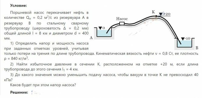 Задача (Куколевский И.И.) 14-10. Поршневой насос перекачивает нефть в количестве Qн = 0,2 м3/с из резервуара A в резервуар B по стальному сварному трубопроводу (шероховатость Δ = 0,2 мм) общей длиной l = 8 км и диаметром d = 400 мм.