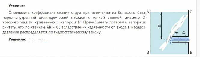 Для студентов по предмету Механика жидкости и газа (МЖГ или Гидравлика)Определить коэффициент сжатия струи при истечении из большого бака через внутренний цилиндрический насадок с тонкой стенкой, диаметр D которого мал поОпределить коэффициент сжатия струи при истечении из большого бака через внутренний цилиндрический насадок с тонкой стенкой, диаметр D которого мал по