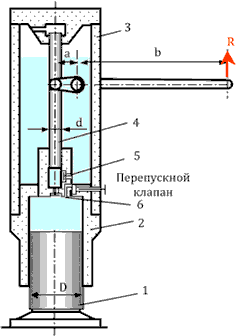 Гидравлический домкрат состоит из неподвижного поршня 1 и скользящего по нему цилиндра 2, на котором смонтирован корпус 3, образующий масляную ванну домкрата, и плунжерный насос 4 ручного привода с всасывающим 5 и нагнетательным 6 клапанами.