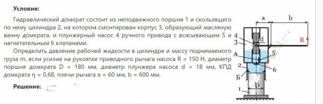 Определить давление рабочей жидкости в цилиндре и массу поднимаемого груза m, если усилие на рукоятке приводного рычага насоса R = 150 Н, диаметр поршня домкрата D = 180 мм, диаметр плунжера насоса d = 18 мм, КПД домкрата η = 0,68, плечи рычага a = 60 мм, b = 600 мм