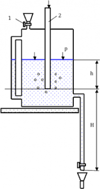 Для поддержания постоянного расхода жидкости при исследованиях широко применяется сосуд Мариотта. После заполнения сосуда жидкостью кран 1 закрывается. Во время опорожнения сосуд соединен с атмосферой только трубкой 2. Начавшееся истечение приводит к