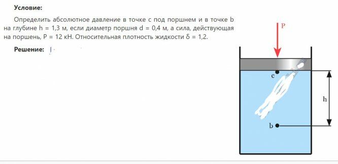 Главная » Учебные материалы » Механика жидкости и газа (МЖГ или Гидравлика) » Решения задач » Несколько классов/семестров » Определить абсолютное давление в точке c под поршнем и в точке b на глубине h = 1,3 м, если диаметр поршня d = 0,4 м, а сила, действующая на поршень, Р = 12 кН. Относительная плотность жидкости δ = 1,2.