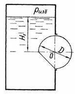 Главная » Учебные материалы » Механика жидкости и газа (МЖГ или Гидравлика) » Решения задач » НГТУ им. Р.Е. Алексеева » Несколько классов/семестров » Номер 2 » Вариант 25 » Закрытый резервуар имеет прямоугольное окно длиной L=1,20м и шириной D, которое закрывается цилиндрическим затвором. На свободной поверхности воды избыточное давление pизб . Глубина погружения оси затвора H1 . Определить усилие на цапфы и момент возд
