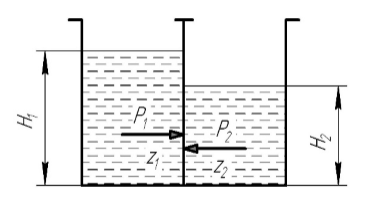 Главная » Учебные материалы » Механика жидкости и газа (МЖГ или Гидравлика) » Решения задач » Несколько классов/семестров » Прямоугольный резервуар разделен стенкой на два отсека. Глубина воды в первом отсеке Н1 = 1,5 м, во втором отсеке Н2 = 0,9 м, ширина резервуара b = 1,2 м. Определить силы давления Р1 и Р2, действующие слева и справа и точки их приложения, а также вел
