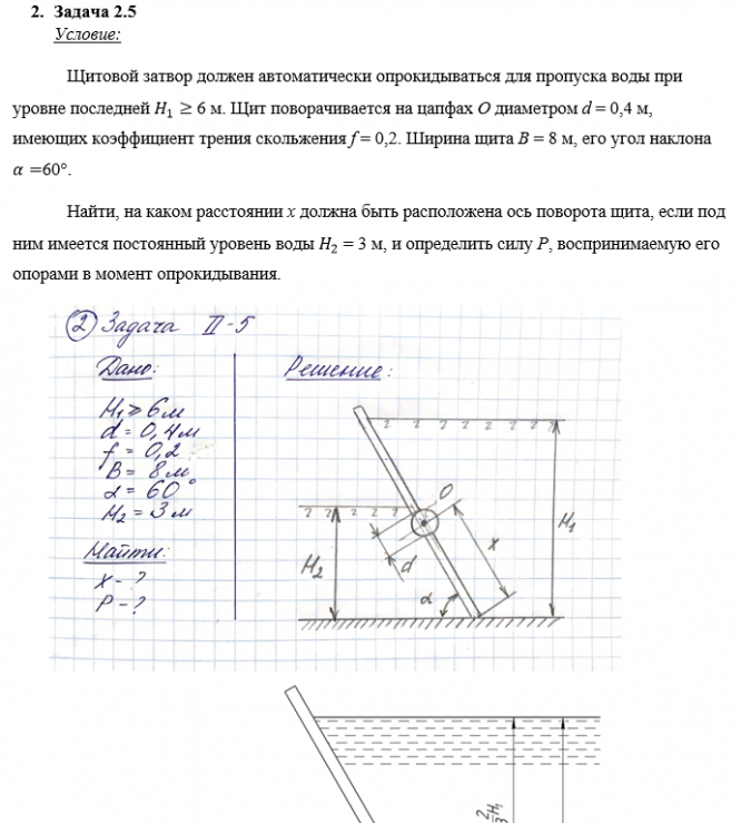 Задача (Куколевский И.И.) 2-5. Щитовой затвор должен автоматически опрокидываться для пропуска воды при уровне последней Н1>6 м. Щит поворачивается на цапфах О диаметром d =0,4 м, имеющих коэффициент трения f = 0,2. Ширина щита B = 8 м, его угол наклона а = 60°. Найти, на каком расстоянии х должна быть расположена ось попорота щита, если под щитом имеется постоянный уровень воды H2 = 3 м, и определить силу Р, воспринимаемую его опорами в момент опрокидывания.