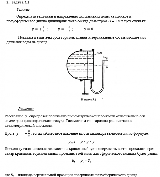 Задача (Куколевский И.И.) 3-1 . Определить величины и направления сил давления воды на плоское и полусферическое днища цилиндрическою сосуда диаметром D=1 м в трех случаях: y=+D/5,  y=-D/5,  y=0 Показать на чертеже горизонтальные и вертикальные составляющие и полные силы давления воды на днища. Ответ. Горизонтальные составляющие сил давления на правое и левое днища одинаковы и равны + 1,54 кН; - 1,54 кН и 0; вертикальные составляющие сил давления на полусферу одинаковы для трех случаев и равны 2,57 кН..