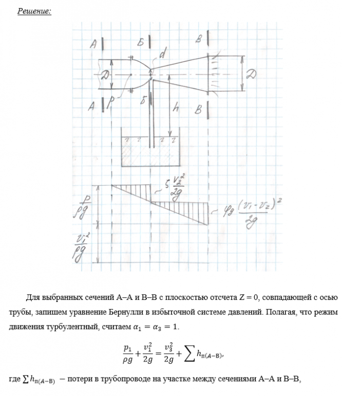 Задача (Куколевский И.И.) 7-13. Труба диаметром D = 40мм имеет на конце сходящийся насадок с горловиной d = 20 мм и коэффициентом сопротивления ? = 0,08, переходящий в диффузор с коэффициентом потерь 0,3, из которого вода вытекает в атмосферу. Какой расход надо пропускать по трубе и какое при этом будет давление р перед насадком, чтобы в горловину начала поступать вода, подсасываемая на высоту h = 2 м из открытого сосуда? Построить график напоров при этом расходе.