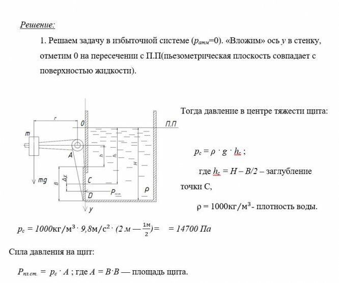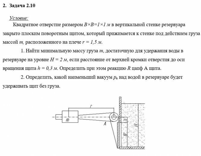 Задача (Куколевский И.И.) 2-10 . Квадратное отверстие размером В*В = 1*1 м в вертикальной стенке резервуара закрыто плоским щитом, который прижимается к стенке грузом О на плече r = 1,5 м. 1) Найти минимальную величину груза G, достаточную для удержания воды в резервуаре на уровне H=2 м, если расстояние от верхней кромки отверстия до оси вращения щита h = 0,3 м. Определить при этом реакцию R цапф А щита. 2) Определить, какой наименьший вакуум ри над водой в резервуаре будет удерживать щит без груза? Ответ. m = 857 кг, R= 16,9 кН, Рв = 15,7 кПа..