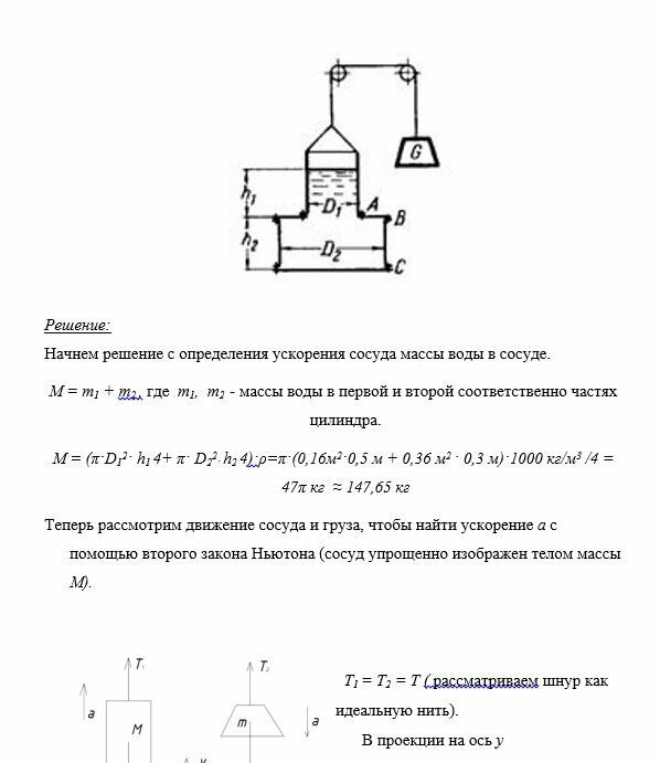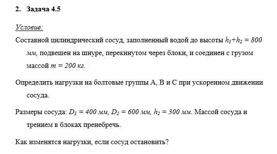 Задача (Куколевский И.И.) 4-5. Составной цилиндрический сосуд, заполненный водой до высоты h1+h2 = 800 мм, подвешен на шнуре, перекинутом через блоки, и соединен с грузом массой m = 200 кг. Определить нагрузки болтовых групп А, В и С при имеющем место ускоренном движении сосуда. Размеры сосуда D1 = 400 мм, D2=600 мм, h1 = 300 мм. Собственным весом сосуда и трением в блоках пренебречь.