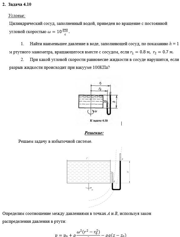 Задача (Куколевский И.И.) 4-10. Цилиндрический сосуд, заполненный водой, приведен во вращение с постоянной угловой скоростью w = 10 рад/с. Найти наименьшее давление в воде, заполняющей сосуд, по показанию h= 1 м ртутного манометра, вращающегося вместе с сосудом, если r1 = 0,8 м; r2 = 0,7 м. При какой угловой скорости равновесие жидкости в сосуде нарушится?