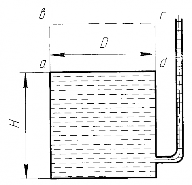 Вертикальный цилиндрический резервуар заполнен водой, находящийся под избыточным давлением Р=0,5 атм (4,9 Н/см2). Определить силу Р1, открывающую верхнее днище от цилиндрической части и силу Р2, разрывающую цилиндрическую часть резервуара по образующей, если диаметр резервуара D=2 м, высота его Н=4 м.