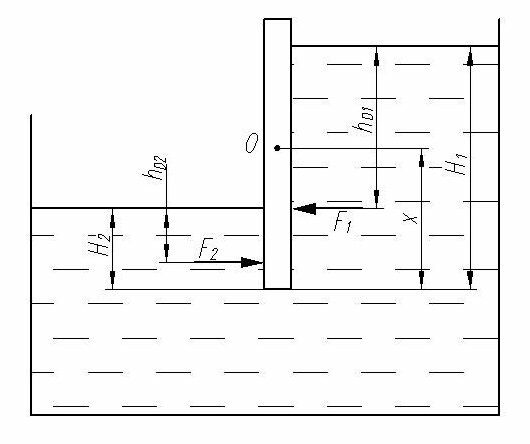 Главная » Учебные материалы » Механика жидкости и газа (МЖГ или Гидравлика) » Решения задач » Несколько классов/семестров » Прямоугольный вырез в перегородке резервуара закрывается поворот-ным щитом шириной B. Определить на каком расстоянии x должна быть распо-ложена ось поворота щита, чтобы он автоматически открывался при достижении уровня в правой секции ≥H1. Трением пр