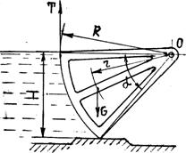 При закрытом затворе ось его вращения и верхний обрез сектора лежат в одной горизонтальной плоскости, расположенной выше свободной поверхности на расстоянии h=1 м.
