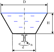 Определить минимальную частоту вращения n, которую нужно сообщить сосуду, изображенному на схеме, вокруг его вертикальной оси для полного его опорожнения. Размеры: D = 200 мм; d = 100 мм; H = 50 мм.