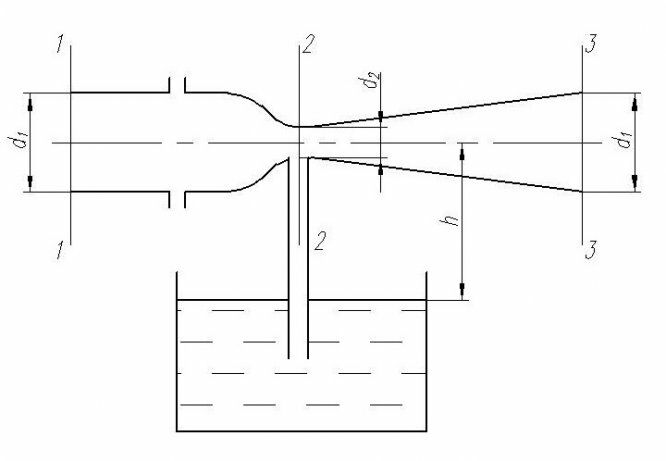Труба диаметром d1=40 мм имеет на конце сходящийся насадок с горловиной диаметром d2=20 м (коэффициент сопротивления ξ=0,08), переходящий в диффузор (коэффициент потерь φD=0,3), из которого вода вытекает в атмосферу. Какой расход Q надо пропустить по трубе и какое при этом будет избыточное давление P1 перед насадком, чтобы в горловину начала поступать вода, подсасываемая на высоту h=2 м из открытого сосуда.