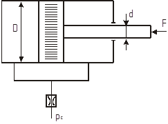 Считая жидкость несжимаемой, определить скорость движения поршня под действием силы F=10 кН на штоке. Диаметр поршня D=80 мм, диаметр штока d=30 мм. Проходное сечение дросселя Sдр=2 мм2, коэффициент расхода μ=0,75, избы-точное давление слива pc=0, п