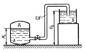 Вода перетекает из бака в резервуар по трубе с диаметром d=25 мм и длиной l=10 м. Определить расход воды Q, если избыточное давление в баке ри=2 атм, H1=l м; Н2=5 м, ν=0,01 см2/с. Принять коэффициенты сопротивления на входе в трубу ξвх=0,5, поворот