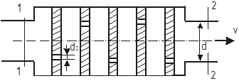 Главная » Учебные материалы » Механика жидкости и газа (МЖГ или Гидравлика) » Решения задач » Определить коэффициент сопротивления пятиступенчатого дросселя, отне-сенный к скорости в трубе с d=5 мм. Каждая ступень представляет сверление в толстой стенке dо=1 мм. Скорость в промежутках гасится до нуля.