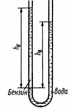 В U-образную трубку налиты вода и бензин. Определить плотность бензина, если hб = 500 мм; hв = 350 мм. Капиллярный эффект не учитывать