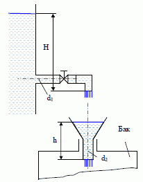 Заполнение бака бензином происходит через воронку диаметром d2=50мм, высотой h=400мм с коэффициентом сопротивления ζ=0,25.