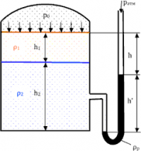 Главная » Учебные материалы » Механика жидкости и газа (МЖГ или Гидравлика) » Решения задач » Несколько классов/семестров » Вода плотностью ρ2 = 1000 кг/м3 и минеральное масло плотностью ρ1 = 800 кг/м3, находящиеся в закрытом резервуаре, сжимают воздух избыточным давлением р0. Поверхность раздела минерального масла и воды находится на расстоянии h1 = 0,3 м от свободной по
