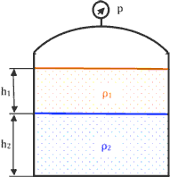 Главная » Учебные материалы » Механика жидкости и газа (МЖГ или Гидравлика) » Решения задач » Несколько классов/семестров » Сосуд содержит две несмешивающиеся жидкости с плотностями ρ1 и ρ2. Давление над свободной поверхностью измеряется манометром. Определить избыточное давление на основания сосуда, если pм = 102 Па; ρ1 = 890 кг/м3; ρ2 = 1280 кг/м3; h1 = 2,1 м; h2 = 2,9