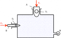 Два плунжера A и B, находящиеся в горизонтальной плоскости, уравновешены. Определить показание манометра и силу F2, если силы F1 = 600 Н, площади плунжеров соответственно S1 = 60 см2, S2 = 5 см2.